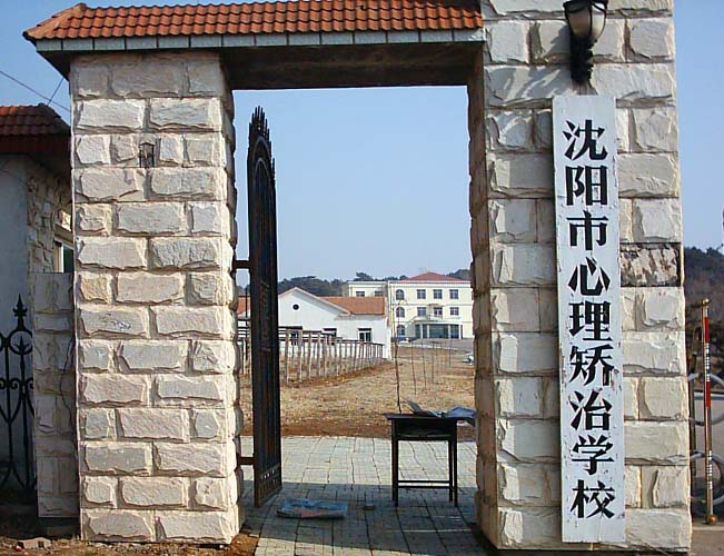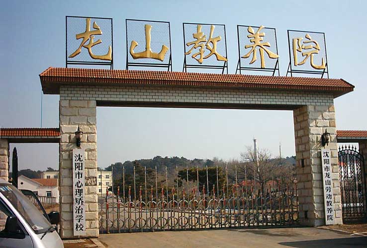 Oben an dem Tor steht: "Long Shan Arbeitslager" Links steht: "Die Psychologische Korrigierungs-Schule in Shen Yang" Rechts steht: Shen Yang, Long Shan Arbeitslager.