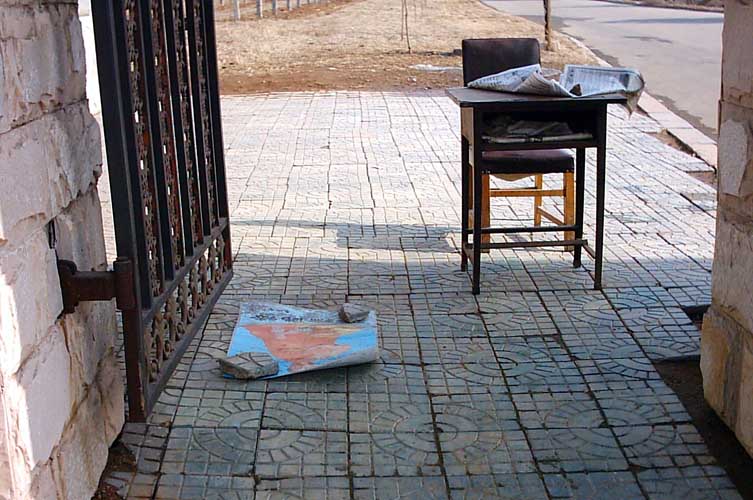 Auf dem Boden liegt ein Bild von Li Hongzhi (dem "Gründer" von Falun Gong) in Meditationshaltung, und auf dem Stuhl sitzt normalerweise eine Wache: wenn sich jemand weigert auf dem Bild herumzutrampeln, wird er als Falun Gong-Praktizierender "entlarv...