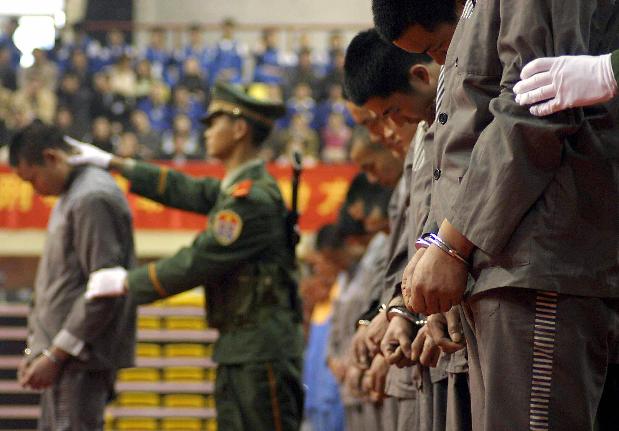 CHENGDU, CHINA: Condemned prisoner Liu Tianlong , who was sentenced to death for robbery and murder, under guard as he is paraded in front of thousands of spectators who turned up to watch the executions at a stadium in Chengdu, China's southwestern...