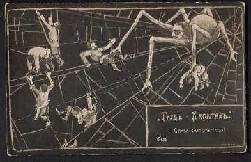 Arbeiter und Kapitalist - Propaganda-Zeichnung der Kommunistischen Partei welche die „Kapitalisten“ als eine den armen Arbeiter „aussaugende“ Spinne darstellt.